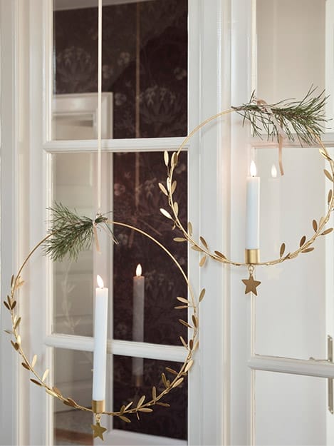 Kaarsen zijn niet alleen voor tafels en vensterbanken. Laat deze kerst het licht van een raam of plafond schijnen met deze kaarsenhouder van House Doctor. De hangende kandelaar heeft een messing afwerking en is versierd met bladeren en een ster voor extra details. Doe er een lint overheen, plaats een LED-kaars en hang de kandelaar op waar je maar een elegante look wilt. Vooral als je geen tafel of ander oppervlak hebt om een gewone kandelaar op te zetten. Voor een persoonlijke look versier je de ring met een licht ornament of zelfs een paar takjes. Gezien de grootte van de kaarsenhouder raden we LED-kaarsen aan met een maximale grootte van 16 cm.