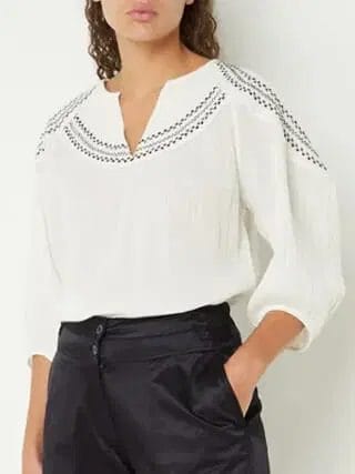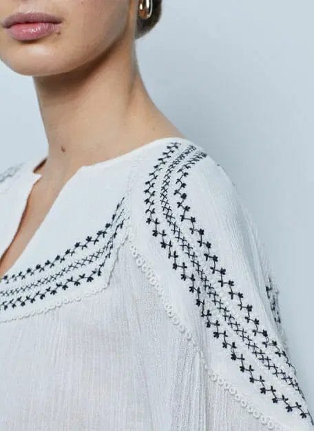 Deze katoenen top met borduursel heeft halflange ballonmouwen is iets transparant en is een losvallend model. Valt normaal op maat. Met crinkle effect.